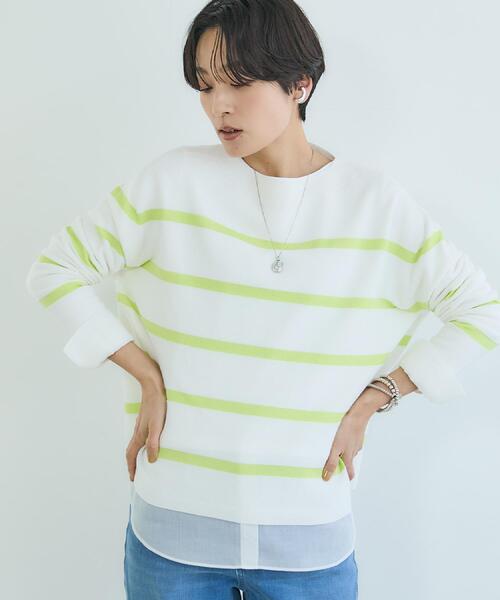 【デザイン】 シンプルなクロップド丈のAライン風のシルエットが特徴のニットプルオーバー。 少し立ち上がったワイドボートネックやすっきりとしたストレート袖は 袖口にリブを用いず、自然にすとんと落ちるラインが、モダンな表情を感じさせます。 【素材感】 コットンの爽やかな肌触りと、ポリエステルの適度な膨らみと弱ストレッチ性が特徴の素材。 【着こなしポイント】 デニムやワイドパンツを合わせて、肩の力を抜いたカジュアルなリラックスコーデやナロースカートでちょっとしたお出かけスタイルに。 インナーにシャツを重ね着して衿を少し見せるトラッドなスタイリングもおすすめです。 ※照明の関係により、実際よりも色味が違って見える場合があります。また、パソコン・スマートフォンなどの環境により、若干製品と画像のカラーが異なる場合もございます。 モデル情報:身長163cm B80 W59 H82 着用サイズ:02(M) 店舗へのお問い合わせ商品番号:153-15355 ●製品寸法: 00(XS):着丈51cm B108cm 袖丈48cm 肩幅48cm 02(M):着丈54cm B120cm 袖丈50cm 肩幅52cm 04(2LT):着丈58cm B126cm 袖丈51cm 肩幅55cm 44(3L):着丈57cm B134cm 袖丈49cm 肩幅57cm 48(5L):着丈57cm B142cm 袖丈49cm 肩幅61cm 備考: