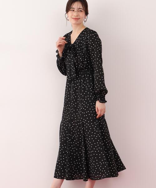ランダムドットプリントがフェミニンな印象を引き立てるワンピース 顔まわりをすっきり見せるVネックに、胸元のリボンが上品で華やかなアクセントを添えます。 スカートはヒップラインをすっきりと見せつつ、裾に向かって軽やかに広がるマーメードシルエットに。 ウエストと袖口のゴムシャーリングが全体をほどよく引き締めた、上品さと女性らしさを兼ね備えた一着です。 【素材説明】 ハリ感と落ち感をほどよく備え、軽さと上品な光沢をあわせ持つ生地に、ランダムドットをプリントした素材。 シルクのような艶やかな光沢ときしみ感が特徴です。 【商品特性】 ストレッチなし/身頃のみ裏付き/ポケットなし/ウエスト・袖口シャーリングゴム/くるぶしくらいの丈 ◆お買い物をよりお楽しみいただくために◆ ・「商品のお気に入り登録」で完売カラーの再入荷やラスト1点、セール通知を受け取ことができます。 ・「ブランドのお気に入り登録」で新商品の入荷情報など、いち早く受け取ることができます。