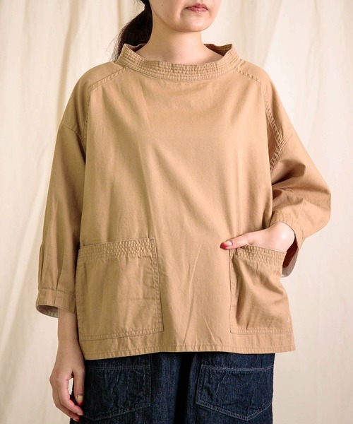 [ 26Spring & Summer ]フランス語で "pecheur" ぺシュール=漁師、釣り人ヴィンテージディテールタフなオックス生地を使用すっきりとしたバランスのシルエット<素材・デザイン>フィッシャーマンスモックをデザインベースに庭師の作業着としてのイメージで製作したスモックシャツ。ゆったりとしたボクシーなシルエットと立ち感のある首元が特徴的。服の上やワンピースの上などからバサッと着られるイメージで、使い勝手の良いワークテイストのアイテム。裾のポケットやステッチワークにもデザインをプラスしました。20/16オックスは軽くも、タフな使用に耐えられる扱いやすいワーク素材。ガシガシ洗って着込んで愛着のある一着にしてください。…………………… 透け感:なし裏地:なし厚さ:普通伸縮性:なし洗濯:可能……………………コットン100%サイズ表記は2(FREE)となります◇着用レビューH158 / 着用サイズ 2(FREE)インナーにハイネックのカットソーを重ねたり、袖からインナーをチラ見せしたり1枚で着るだけじゃなくレイヤードスタイルも楽しめます。デコルテラインがきれいに見える立ち感のある首元が◎袖を折り返すとよりカジュアルに着こなせます。H160 / 着用サイズ 2(FREE)実際に着用すると首の開き具合が気になりにくく、重ねたコーデもオススメ◎しっかりとした生地ですが、重みや硬さを感じないのも嬉しいポイントです。人気のトヌーパンツやアンプリッセとの相性も良く、Brocanteの雰囲気を楽しめます。[Brocante / ブロカント]フランス語で古道具、市場を意味する。 およそ100年ほどの年月のたった日常的な生活用品、古道具。そういったもののみが集められた市場の意としても用いられる。けして派手ではないけれど、どこか昔出会ったことのあるような懐かしさ、温かみを感じるような・・・・・・ 何代もの人に手渡り、生活に根付いて時を経てきたものからインスピレーションを受けて、モノづくりをしてくブランドです。お問合わせ品番 : 36-0343X / 36-343X