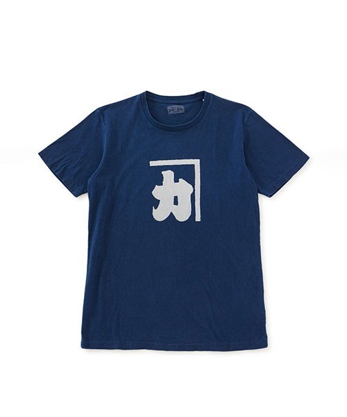 【デザイン】カタカナのカの上にある【¬】カネは、古い飲食店では屋号としてよく使われていた記号で、曲尺(かねじゃく)のように真っ直ぐであること、との思いが込められているといわれています。インディゴ染のTシャツに抜染で表現しました。 BLUE BLUE JAPAN 手作業で縫い合わせた、温もりを感じられる藍を中心としたモノ作りからはじまりました。着心地が良く長年着用していただけるものを日本の伝統技法である本藍染めを中心に、四季を感じさせる色や素材を使用し「MADE IN JAPAN」にこだわりながら作っています。