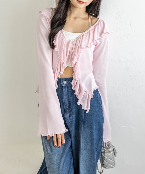 【2026SS】 clear フリルで包むやさしい甘さ!フリルニットロングカーディガン 【デザイン】 フロントから裾にかけて施されたフリルデザインが、女性らしさを引き立てるニットカーディガン。 やわらかなニット素材で、軽く羽織れる着心地の良さが魅力。 甘さのあるフリルも、シンプルなシルエットに落とし込むで、 デイリー使いしやすい一着に仕上げました。 【素材感】 伸縮性のあるレーヨン素材 伸縮性:若干あり/ 透け感: アイボリーのみ若干あり/ 裏地:なし 水洗いによる洗濯不可 / ドライクリーニング可 【コーディネート】 フレアミニスカートやティアードスカートと合わせて王道ガーリースタイルに。 ワンピースの上に羽織って大人フェミニンスタイルにも♪ デニムやスニーカーと合わせてカジュアルミックススタイルも可愛いです! 【※お取り扱い上のご注意】 1:モニター環境等により実際の商品と多少色味が異なって表示される場合がございます。予めご了承下さい。 2:屋外で撮影された商品は、天候により多少実際のカラーと異なる場合があります。商品のカラーはトルソー(マネキン)の商品画像をご参照ください。 3:濃い色の商品は、お洗濯や摩擦等による移染にご注意ください。 4:末永くご愛用頂く為に、アテンションタグ・洗濯ネームを必ずご確認の上、着用又はお取り扱い下さい。 5:生産時期により、色、サイズ、デザイン、素材の質感が多少が異なる場合がございます。あらかじめ御了承下さいませ。