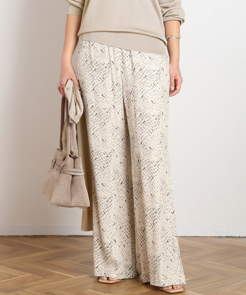 女性らしいニュアンスカラーが素敵なパイソン柄パンツ。柄が主役になるシンプルなデザインで、ウエストゴム仕様でイージーで使いやすいシルエットです。落ち感と滑らかさのある素材で高級感があり、パイソン柄でも強さが抑えられた印象で、カジュアル見えになり過ぎずデイリーに着まわせる一着。幅広いコーディネートのアクセントとしてスタイリングをお楽しみ頂けます。※照明の関係により、実際よりも色味が違って見える場合があります。またパソコン・スマートフォンなどの環境により、若干製品と画像のカラーが異なる場合もございます。※商品の色味は、商品アップ画像をご参照ください。モデルサイズ:H163 着用サイズ:38本体:ドライクリーニング