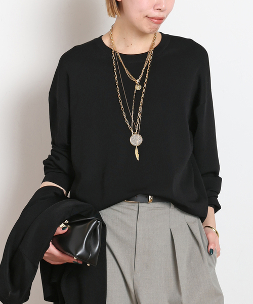 クラシックで洗練されたスタイルに合う、1枚着として便利なニット。高級感のある微光沢なシルク混の編地は、ドライタッチで肌触りも良く特別感があります。程良い立体感と滑らかさがあり美しいシルエットが出て、ヒップにかかるくらいの余裕のあるサイジングです。クリーンなニュアンスカラー、トレンドレスなキャメル、AP STUDIOらしい黒の3色展開。ジュエリーや時計などの小物を効かせて綺麗目でちょっとリッチなスタイリングやデニムでこなれ感を演出するのも素敵です。ホームクリーニングが出来るのも、これからの季節に嬉しいポイント。※シリーズのご紹介26080586202010_Demure Cardigan_35,200円(税込)26080586204010Demure N/SL knit_22,000(税込)※照明の関係により、実際よりも色味が違って見える場合があります。またパソコン・スマートフォンなどの環境により、若干製品と画像のカラーが異なる場合もございます。※商品の色味は、商品アップ画像をご参照ください。モデルサイズ:H163 着用サイズ:フリー本体:手洗い可能