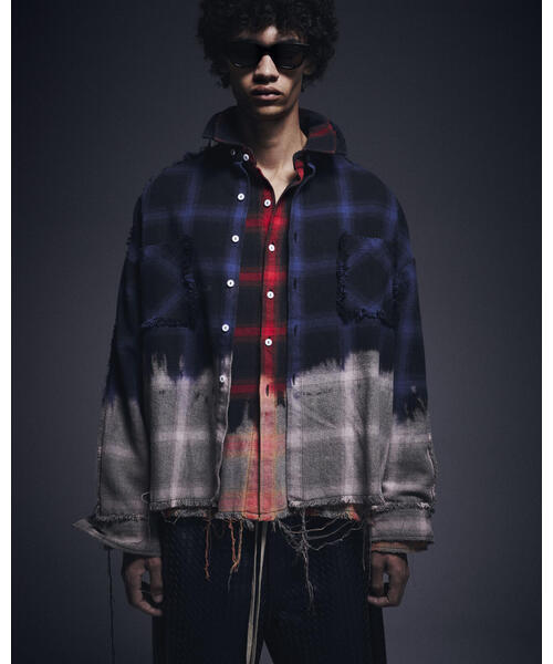 DankeSchonヴィンテージライクなチェック柄が存在感を放つ、クロップド丈フランネルシャツ。全体に施されたグラデーション調の色落ち加工と、肩・裾・ポケット部分のほつれディテールが、ラフでエッジの効いた表情を演出します。程よく短めの着丈とワイドすぎないシルエットで、ストリートからモードまで幅広くフィットする一着。フロントボタン仕様により、シャツとしてはもちろん、軽い羽織としても着用可能です。■POINT・ヴィンテージ感を演出するチェック柄×色落ち加工・エッジを効かせたほつれディテール・バランスの取りやすいクロップド丈シルエット■STYLE TIPワイドデニムやカーゴパンツと合わせたストリートスタイルはもちろん、スラックスと合わせれば都会的なミックススタイルに。インナーに無地Tシャツやフーディーをレイヤードすることで、より立体感のある着こなしが完成します。一枚で主役になる、スタイリングの幅を広げてくれるアイテムです。DankeSchon・・・DankeSchonとは、このブランドの核となるキーワードD digitaliyデジタル式A Architect創造者N neologism新表現K kittenish悪ふざけE engrossing心を奪うの頭文字を組み合わせたものにドイツ語のSchonを付け、ブランドの意図に賛同してくれる人達に感謝の意味を込め、「DankeSchon(ありがとうの意味)」としている。