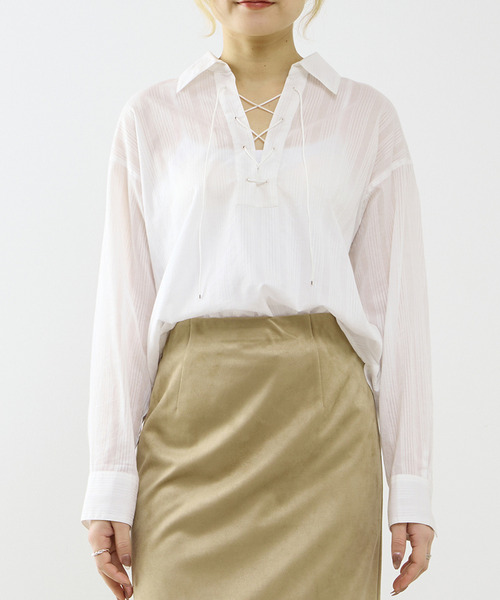 今年注目の編み上げディテールを取り入れた、トレンド感のあるブラウス。 シンプルになりがちなスタイリングも、さりげないデザイン性で一枚で様になります。 素材にはオーガニックコットンを使用したシャドーストライプ生地を採用。 無地とはひと味違う奥行きのある表情が、大人らしい上品な印象を演出します。 ドビー織機で丁寧に織り上げ、ストライプの色味を同系色でまとめることで、 主張しすぎず、デイリーからきれいめスタイルまで幅広く活躍する一着に仕上げました。