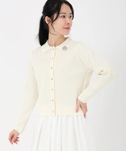 *ポーツポリー胸元に宿る、ヴィンテージのような気品。ブローチ風ビジューが主役の、クラスアップ・ニット。 アクセサリーいらずで、完成された美しさを。 まるで大切に受け継がれたアンティーク・ブローチを添えたような、デコラティブなビジュー刺繍が目を惹くカーディガンです。 クラシックな衿付きデザインと相まって、纏うだけでお顔周りをドラマティックに、そして知的に演出します。 洗濯:ドライクリーニング ■ Design & Fabric 最大の特徴は、一粒一粒の輝きが際立つ「ブローチ風」のビジュー刺繍。 単なる装飾ではなく、まるでジュエリーを纏っているかのような立体感と重厚感にこだわりました。 ベースとなる「ポーツポリー」素材は、なめらかな肌触りと適度なハリ感が魅力。 シルエットを崩さず、ビジューの重みをしっかりと支えながら、一日中ストレスフリーな着心地をキープします。 ■ Styling ブローチ風の華やかさを活かすなら、ボトムスはあえてシンプルなスラックスや、上品な「ジョーゼット」のスカートを。 お出かけの日には、チュールスカートと合わせて思い切りレディに。 デニムと合わせた際も、このビジューがあるだけで「手抜き感」のない、洗練された大人のミックススタイルが完成します。 ボタンを閉じて「きちんと」着こなせば、会食などのシーンでも、誰より美しく輝けるはず。 《お気に入り登録》はお得がいっぱい! 「商品」のお気に入り登録で、再入荷、ラスト1点、セールなどお得な通知を受け取ることができます。 「ブランド」のお気に入り登録で、新商品や再入荷などいち早くブランドの情報を受け取ることができます。 是非、この機会にご登録くださいませ。