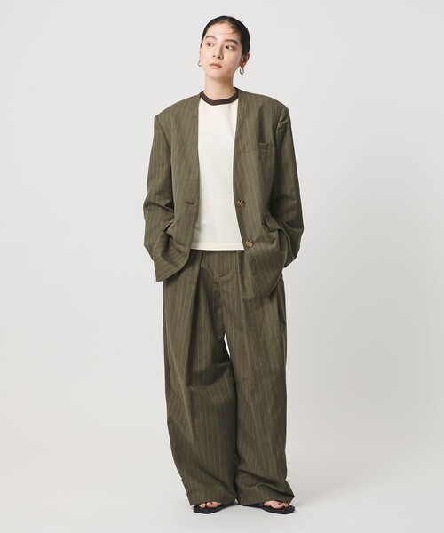 今の気分に寄り添うデザインと上質な素材感のアイテムを厳選し、洗練されたムードを表現する“RED BEAUTY&YOUTH”。 前後ギャップが楽しめるカラーレスジャケット ■デザイン スタンダードな中に垣間見える女性らしさや遊び心、エッジを加えたディテールなど、相反する要素を掛け合わせることでオリジナリティのある世界観を表現。 コーディネート次第でラフな側面ときちんと感のある表情の変化を楽しめるラインナップを揃えました。 こちらは、ストライプのカラーレスジャケット。 バックスタイルはタックを入れてウエストをシェイプさせ、メリハリのついたシルエットに仕上げました。 やや長めの着丈の抜け感漂うルックスもポイント。 モードな雰囲気のブラックと大人のカジュアルスタイルにぴったりなオリーブの2色をご用意しました。 ■素材 麻混のナチュラルな風合いが特徴の生地。 ピンストライプでシャープな印象をプラスしました。 ■コーディネート 同素材のパンツとのセットアップスタイルも◎。 ワイドシルエットのボトムとのマニッシュな装いもおすすめです。 ・同素材でパンツ(対象品番:16142000020)のご用意もございます。 ============================ 裏地:あり 透け感:なし 伸縮:なし 光沢感:なし ケア方法:ドライクリーニング ============================ 【注意事項】 ※商品に「取り扱い上の注意書き」、「洗濯表示」がございます場合は、使用前に必ずご確認ください。 ※商品画像は、光の当たり具合やパソコンなどの閲覧環境により、実際の色味と異なって見える場合がございます。あらかじめご了承ください。 ※商品の色味の目安は、商品単体の画像をご参照ください。 店舗へお問い合わせの際は、全国のBEAUTY&YOUTH各店舗まで下記の品名/品番をお申し付けください。 品名:RD PE/L/R STRP C/LESS JK 品番:16222000011