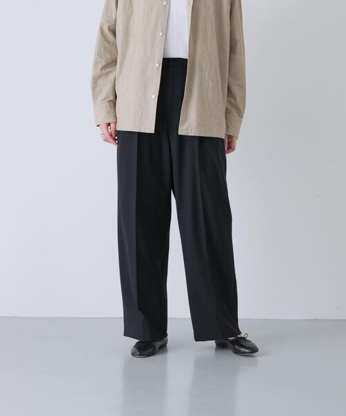いつものトップスをきれいめな雰囲気に1本持っているとコーディネートの幅が広がるパンツをご紹介します。生地はサマーウール素材を使用したクリアな風合い。タックから続くセンタープレスが美しいシルエットを生んでいます。生地のストレッチ性とウエストに入ったゴムベルトが伸びて楽に着られるのも嬉しいポイント。かっちりとした印象ながらも着心地はストレスフリーな優秀アイテム。ループが付いているのでアクセントにベルトを通しても◎薄手で着やすくロングシーズン対応が可能です。肌寒い時にはレギンスを重ねていただくのがおすすめ。【FABRIC】・毛羽立ちが少ないサラッとしたタッチ・程よい伸縮性・合わせやすいカラー展開【POINT】・両脇とヒップにはポケット付き・裾はルイス始末で高級感のある仕上がりに【2026 Spring/Summer】【26SS】※商品画像は、光の当たり具合やパソコンなどの閲覧環境により、実際の色味と異なって見える場合がございます。予めご了承ください。※商品の色味の目安は、商品単体の画像をご参照ください。▼お気に入り登録のおすすめ▼お気に入り登録された商品は、マイページにて現在の価格情報や在庫状況の確認が可能です。お買い物リストの管理にぜひご利用ください。素材感透け感 : なし伸縮性 : ややあり裏地 : なし光沢 : なしポケット : ありBLACK:167cm(1) / 162cm(1)10