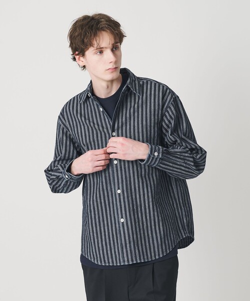 ジャガードストライプ×13ozデニムが放つ圧倒的存在感。 「アウターの風格をまとった、主役級デニムオーバーシャツ。」 ■デザイン 肩幅と袖幅をしっかりと広くとり、スウェットやミドルゲージニットの上からも余裕で羽織れる迫力のオーバーシルエット。 前立ては幅広に、背ヨークも大胆に設定することで、見た目からもアウターライクな重厚感が漂う仕上がりに。 トレンドのリラックス感と、無骨さを兼ね備えた“ちょうどいいラフさ”。 着るだけでスタイルに深みを出す、存在感ある一枚です。 ■素材 生地から開発した、ジャガード織りストライプの別注デニムを採用。 13オンスのしっかりとした厚みは、ジーンズ同等のタフさがありながら、ジャガードならではの立体感ある表情が魅力。 さらに、ストーンバイオ+ブリーチ加工でヴィンテージのような自然な色落ちを表現。 既製のデニムでは出せない、奥行きのある色ムラと風合いが、スタイリングに洒落たニュアンスを生みます。 ■コーディネート 一枚で圧倒的に“映える”デザインなので、他アイテムはワントーンでまとめて引き算するのが◎。 シンプルなアイテムに羽織るだけでスタイリングが完成し、“こなれた大人のデニムスタイル”を簡単に楽しめます。 ============================ 透け感:なし 伸縮:なし 光沢感:なし ケア方法:手洗い可 ============================ 【注意事項】 ※商品に「取り扱い上の注意書き」、「洗濯表示」がございます場合は、使用前に必ずご確認ください。 ※商品画像は、光の当たり具合やパソコンなどの閲覧環境により、実際の色味と異なって見える場合がございます。あらかじめご了承ください。 ※商品の色味の目安は、商品単体の画像をご参照ください。 店舗へお問い合わせの際は、全国のBEAUTY&YOUTH各店舗まで下記の品名/品番をお申し付けください。 品名:SC STRIPE DNM OVER SHT 品番:12111000018