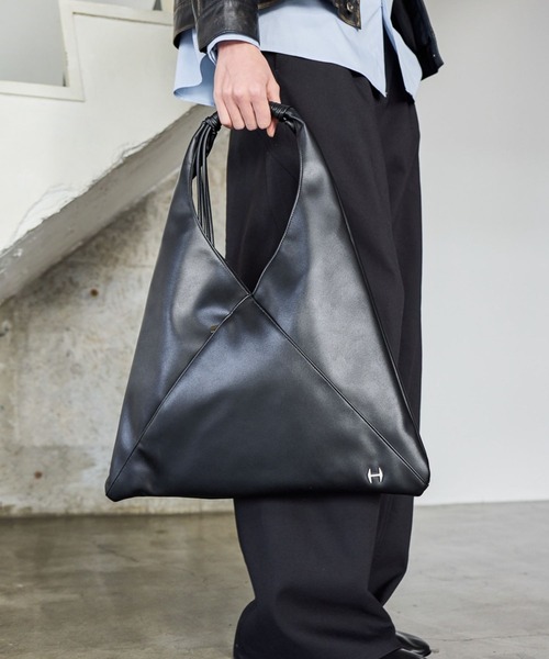 ーーーHAREで絶大な人気を誇る「サンカクバッグ」が、さらなる進化を遂げて登場。 今作は、ブランドの頭文字である「H」を起点にしたパーツをさりげなく装飾。単なるアップデートに留まらない、徹底したこだわりを凝縮。ーーーPOINTシャープな三角形のシルエットは、どんなコーディネートも瞬時に「モード」へと格上げします。オリジナルで型から製作した「H」パーツ。バッグのミニマルでシャープな雰囲気を邪魔しないさりげない1ポイントに。生産先と厳選した、滑らかな質感のシンセティックレザーが、上品な光沢と都会的な印象を放ちます。持ち手部分には、デザインのアクセントとなる細かな巻き込みデザインやメタルパーツを配し、手持ちでも肩掛けでも様になる、隙のない仕上がり。シャープな見た目に反して、日常の必需品がしっかり入る設計。日常使いはもちろん、見た目以上の収納力で通勤通学にもおすすめ。ボディのハギキリカエには、ZIPポケットを設置。スマホや財布など、「しまいたいけど、すぐに取り出したい」「バッグのメインポケットに入れて他の物とごちゃごちゃしたくない」などの小物におすすめ。ジェンダーレスで使用できるデザイン、機能を追求。きれいめモード好きの全ての人のスタイルにフィット。