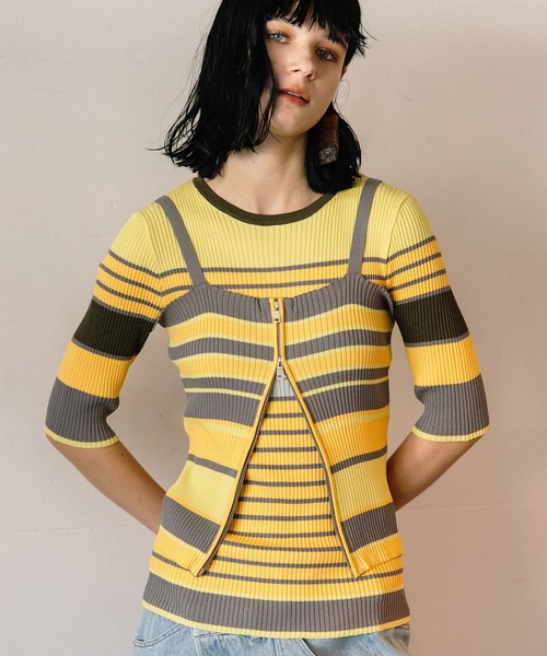 様々な着方が可能なマルチニット。 【FABRIC】 透け感:なし 厚さ:薄手 伸縮性:あり 裏地:なし ポケット:なしレーヨンポリエステルの柔らかい肌触りで、 型崩れしにくい糸を使用した14Gのリブ編み。 【DESIGN】 綺麗な5配色のマルチなボーダーの5分袖プルオーバーは、 インナーでも1枚でも目を惹くアイテム。 ダブルジップアップのベアキャミソールもセットで、 裾を開けてスリットのように着ると、動き易く細見え効果あり。 【STYLING】 セットで着ても、単品で着てトレンド感のあるレイヤードコーデもおすすめ。 ベアキャミソールは、プルオーバーとは異なるボーダー柄で、前後で着用可能。 キャミ部分を隠してベアトップ風、腰の位置まで下げてフレア風に着たりと様々な アレンジが可能。 ※生産の都合上、商品の納期が変更となる場合がございます。 ※商品の画像はサンプルのため、実際の製品とは仕様や加工、サイズ等が若干異なる場合がございます。 ----------------------------- - AULA AILA - (アウラアイラ) 自分らしさを大切にしながら、 魅力を引き出し、 何気ない日常に彩りを添え、 纏うという高揚感から心を豊かにする、 大人のハイエンドカジュアル ・商品のお気に入り登録 完売カラーの再入荷通知や、ラスト1点、セールの通知をお知らせ致します。 ・ブランドお気に入り登録 新商品や再入荷など、いち早くブランドの情報を受け取ることができます。