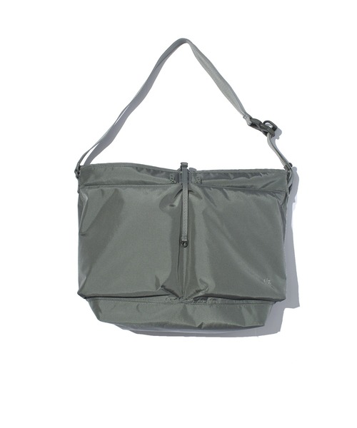 メッセンジャータイプのキャリーショルダーバッグ。 フロントに配置されたヘルメットバッグのようなポケットが特徴です。 ショルダーベルトは、メッセンジャー仕様でワンタッチでアジャスト、調整、が可能です。 身体にホールドできるような仕様になっています。 ナイロンとリサイクルナイロンを混紡した、ツイル組織の上品な印象に仕上げたサスティナブル素材を使用。 -PCスリーブ