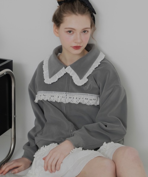 トレンドのフリース素材に、コットンレースをたっぷりあしらったカジュアルガーリーなジャケットが登場。 カジュアルな素材に、ブルゾンのようなゆったりシルエット、 ジップのラフさに あえて大ぶりのレースとガーリーな刺繍を合わせたJUMELLEらしい1枚。 サッと羽織るだけで目を惹く可愛さが魅力です。 前を閉めて着用すれば、冬にも暖かく、 コートの中に合わせるのもおすすめです。 シンプルなコーデにプラスワンするだけで こなれ感たっぷりの印象に魅せてくれる1枚です。