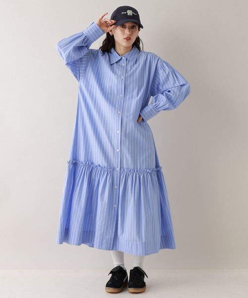 一枚で主役級のストライプワンピース◎ ■おすすめの着こなし ☆一枚で着るなら・・・ さらっと一枚で着こなす、ベーシックなスタイリングがおすすめです。 キャップ×ローファーでアクセントを効かせれば、きれいめカジュアルスタイルが叶います◎ ☆羽織りとして着るなら・・・ ロンT×デニムに羽織りとして着合わせる、カジュアルな着こなしが◎ スラックスと合わせれば、落ち着いた印象で着用いただけます。 ーーー ■ポイント 一枚でサマになる、大人ストライプワンピース。 切り替え部分にはフリルがあしらわれているので、さりげないアクセントに。 程よくゆとりのあるアームホールと身幅なので、楽な着心地です。 着るだけで自然と体型カバー可能なのも嬉しいポイント◎ 一枚でも、羽織りとしても活躍する、シャツワンピースです。 ■素材 さらっとした肌触りで、着心地抜群な混紡素材を使用。 着方次第でロングシーズンお使いいただけること間違いなしです。