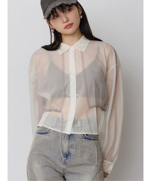 チュールがレイヤードされたシアーシャツさりげない配色もポイント◎■アイテムシアーシャツにチュールがレイヤードされた他にはないデザインシャツ。シアーとチュール部分は配色になっていますが、透け感のある素材感なので派手になりすぎず着用しやすくなってます。チュールの裾部分はドロストの仕様になっており、お好みでギャザーの寄せ具合を調節していただけます。デザイン性の高いアイテムなので、羽織としてはもちろんですが、ボタンを留めてトップスとしての着用もおすすめです。--------------------------------------------透け感:あり 生地の厚さ:薄手伸縮性:なし サイズ感:普通--------------------------------------------【知って得する便利機能◎ 】■商品のお気に入り登録再入荷時、ラスト1点の時にお知らせします。■ブランドのお気に入り登録新商品やお得な情報など、いち早くお得な情報をゲット!ぜひご活用ください。※着用画像はフラッシュの加減で実際の製品と色味等が異なる場合がございますので、生地のズームアップ画像をご確認ください。※ご利用の端末画面の設定により実際の商品と色味が異なる場合がございます。