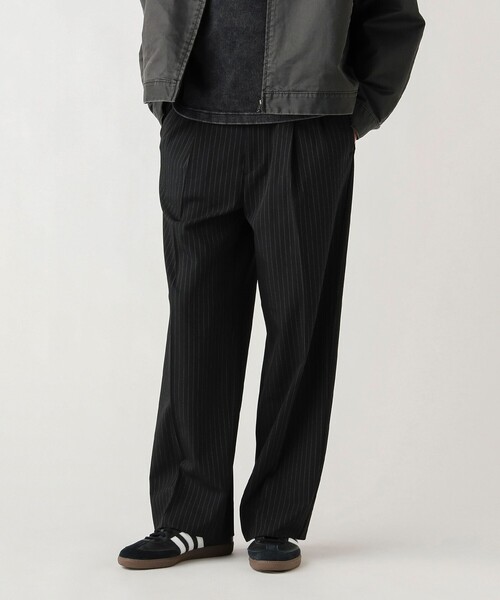 上品な見え感でスタイルを格上げ ■デザイン ヘリテージ感のある2タック仕様を取り入れた、ワイドストレートシルエットのスラックス。腰まわりにゆとりを持たせつつ、裾幅を広めに設定することで、クラシックさと今の気分を兼ね備えたバランスに仕上げています。ウエストは前カン仕様、腰裏にはマーベルト風ディテールを採用し、スラックスらしい端正な印象をさりげなくプラスしています。 ■コーディネート シルエットに存在感があるため、コンパクトなトップスと合わせることで全体がすっきりとまとまります。シャツやカットソーはもちろん、ジャケットスタイルにも取り入れやすく、オンオフ問わず活躍。足元はレザーシューズで上品に、スニーカーで程よくカジュアルダウンするのもおすすめです。 ■素材 ウールライクな見え感のポリエステルPUストライプ素材を採用。やや薄手で軽やかな着用感ながら、落ち着いた見え方が特徴です。日常使いからきれいめなシーンまで幅広く対応します。 ■ケア方法 水洗い・ドライクリーニング両方可 (詳細は商品についている品質表示ラベルをご覧ください) ※光の当たり具合やパソコンなどの閲覧環境によって実際の色味と異なって見える場合がございます。予めご了承ください。 ※商品の色味は商品単体で撮影した画像をご参照ください。