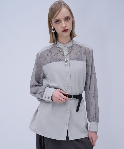 ーーー 小花柄をプリントしたシアー素材の切り替えデザインシャツ ーーー point □オリジナルで作成した小花柄がポイント ・ブラック09はブルーの配色でモードな印象 ・グレー10はパープル系の花柄で華やかさのある上品な印象 □デコルテ回りと袖全体に透け感のあるシアー素材で女性らしさや軽やかさがある □クラシックでコンパクトなスタンドカラー □シルバーのボタンが甘くなりすぎずモード感のでる雰囲気 styling 骨格ナチュラル:ワイドなカーゴパンツやデニムなどでカジュアルダウンするのがおしゃれです。裾はアウトスタイルにしてゆったりとしたシルエットが◎上からベストを重ねて袖のシアーだけ見せるレイヤードスタイルもモードでオススメ。 骨格ウェーブ:ハイウエストのフレアパンツやプリーツスカートを合わせた女性らしいスタイルが似合います。ワントーンコーデでまとめると上品さもありつつモードなシャープさを表現できます。 骨格ストレート:ストレートシルエットのパンツや広がりすぎないタイトスカートに裾はインしてウエスト周りをスッキリさせると〇華奢なチェーンや長さのあるネックレスを合わせて縦ラインを強調すると全体のバランスが整います。 ※加工を施した画像を使用しております。 実物と色味が異なる可能性があるため、色味は詳細後ろにある生地寄り画像を参考にお願いいたします。 あらかじめご了承下さい。