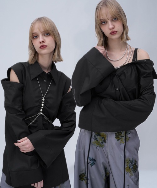 ーーー シンプルシャツ・肩開き・オフショルなど マルチに使えるデザインシャツ ーーー point □袖はボタンでカットアウト仕様、フロントボタンを開けるとオフショル、袖をウエストに巻いてビスチェ風に、マルチに変えられる仕様 □オフショルの肩紐は華奢なチェーン付きで取り外し可能 □腰回りをカバーできるミドル丈シャツ □ハリのある素材でクリーンな印象 □胸元のギャザーが女性らしく、一枚でシンプルに着ても可愛い一枚 styling 骨格ナチュラル:ワイドパンツやフレアパンツなどを合わせたカジュアルさのあるスタイルが似合います。スクエアトゥのシューズを合わせるとよりモードな雰囲気に。 骨格ウェーブ:ハイウエストのボトムスをインして着るか、キャミワンピースを重ねてきるのがオススメ。オフショル仕様にしてパールやゴールドのアクセサリーを付けると女性らしい華やかさが出ます。 骨格ストレート:肩のスリットを入れて顔回りをスッキリさせるとバランスがきれいです。ストレートシルエットのボトムスにウエストはベルトでブラウジングするとクリーンでモードな印象になります。 ※加工を施した画像を使用しております。 実物と色味が異なる可能性があるため、色味は詳細後ろにある生地寄り画像を参考にお願いいたします。 あらかじめご了承下さい。