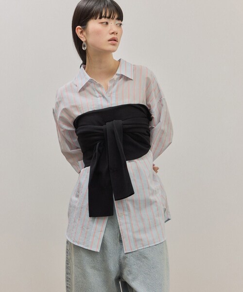 ◇26SS◇ ADAM ET ROPE' FEMME 【Material】 ハイツイストコットン糸にリサイクルポリエステル糸をプレーティングする事で、適度なハリを持たせた天竺編みニット。 【Design】 シャツなどの上にビスチェとして巻いてフロントで縛ったり、ボレロとしての着用も可能な便利なアイテム。 巻く際は胸辺りに商品の中心を合わせて、両脇〜後ろでクロスした後、前の胸位置で片結びをするのがおすすめ。 ビスチェとして巻く設定の長めの袖丈なため、ボレロとしての着用する際は手元でくしゅっとさせて。 【Color】 スタイリングに取り入れやすいブラック、チャコールの2色展開。 【Styling Point】 シャツやTシャツなどの上にビスチェのように巻いて着用するのがおすすめ。 短丈ボレロとしてロンTeeに重ねても素敵。 --------------- 透け感:なし 裏地:なし 伸縮性:あり 光沢感:なし 生地の厚さ:やや薄手 ポケット:なし --------------- ◇モデル情報 身長:165cm size:F ※撮影時の光、お使いのモニター環境によって色の見え方が違う場合がございます。