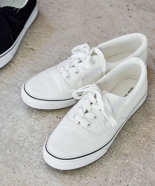 シンプルで軽やかなスニーカー ーーー ・素材/機能 抗菌防臭 撥水 春先に合わせやすい軽やかなキャンバス素材を使用し、 シンプルながらも日常使いに優しい機能も搭載しています。 ・デザイン/アップデートポイント シンプルな内羽根デザイン。サイドゴアを搭載する事によって着脱が楽になり、ストレスフリーな履き心地に◎ 伝統的な加硫製法で作られたシンプルでソリッドなデザインの中にも、 甲周りのすっきりとしたフォルムで他のスニーカーとは異なるスタイリッシュなデザインを実現しています。 ーーー ・おすすめスタイリング ストリートの定番スタイルに合わせるのは勿論の上、単色のアッパーにする事で様々なスタイルにも容易にマッチできます。 ビジカジの足元に合わせてもきれいな外しとして合わせることが可能です