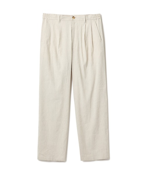 【清涼感と抜け感を纏う、休日の大人の2タックイージーパンツ】軽やかな素材使いとゆったりとしたリラックスシルエットが、肩の力を抜いた心地よい時間を演出。セットアップでも単品でも、肩肘張らない大人の余裕を感じさせるスタイルに仕上がります。【デザイン/素材】ゆったりとした履き心地が魅力の2タック仕様イージーパンツ。素材違いで異なる表情を楽しめる2色展開です。ブラック系〈SMART MERINO オンブレーチェック〉ウール×ポリエステルの梳毛素材「SMART MERINO」を使用。非常に軽量でさらりとしたドライタッチが特徴で、薄手かつ通気性に優れています。オンブレーチェックの奥行きある柄が、清涼感のある大人のカジュアルスタイルを演出します。ベージュ〈ヴィスコースリネン ピンストライプ〉ヴィスコースリネンを使用した、きなりベースのピンストライプ。柔らかな落ち感とリネンならではのナチュラルな風合いに、ストレッチ性を加えた快適な素材感が魅力です。軽やかで上品なカジュアルさが漂い、春夏シーズンに最適です。【シルエット】腰まわりにゆとりを持たせた、リラックス感のある2タックシルエット。ストンと落ちるラインがラフになりすぎず、大人らしいバランスを保ちます。快適さと見た目の美しさを両立した設計です。【ディテール】ウエストはイージー仕様で、ストレスフリーな穿き心地。ドローコード付きで、外側で結ぶことはもちろん、内側にしまってすっきりと着用することも可能です。単品使いでもコーディネートの幅が広がる、汎用性の高い一本。同素材のシャツとセットアップで仕上げると、よりスマートで自然な抜け感を演出し、大人の休日に個性と清潔感をプラスします。同色同素材オープンカラーシャツ:M0162FBC211※照明・光の加減、PCやスマートフォンなどの環境により、製品と画像のカラーの見え方が異なる場合がございます。※画像はサンプルのため、色味やサイズ等の仕様が変更になる場合がございます。※サイズは弊社規定の採寸によって記載しておりますが、若干の個体差が生じる場合がございます。