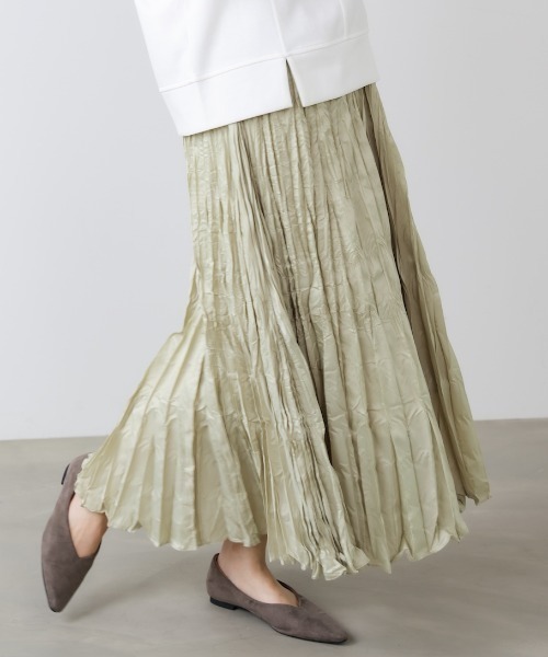 ■POINT表情のあるシワ加工が印象的なロングスカート。動くたびに揺れる分量感と落ち感のある素材で、広がりすぎず大人っぽく仕上げました。コーディネートに自然な立体感をプラスしてくれる一枚です。■FABRIC軽く柔らかな素材に、ニュアンスのあるシワ加工を施しています。■COORDINATEニットやカーディガンと合わせてきれいめに。スウェットやフラットシューズでカジュアルダウンもおすすめです。…………………透感:なし裏地:あり…………………★商品のお気に入り登録 登録すると、完売しても再入荷時に通知を受け取ることができます。 ほかにもお得な特典があるかもしれません♪ ★ブランドのお気に入り登録 新商品や再入荷などの情報を受け取ることができますので、是非ご登録ください♪
