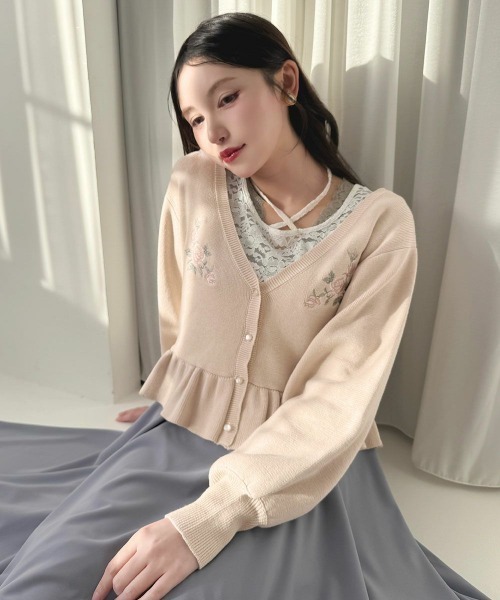 ■デザインポイントペプラムシルエットがとびきりクラシカルなニットカーディガン。胸元には繊細なローズ刺繍を施し、特別感を演出いたしました。淡いカラーリングがシーズンムードを感じさせてくれるポイントに◎■オススメスタイリングVネックの開きがすっきりとした印象のため、ブラウスやシャツをレイヤードしたスタイリングがイチオシ。ボリューム感のあるチュールスカートと合わせたフェミニンな着こなしはもちろん、デニムボトムとさっぱり着こなすのもおすすめです。======透け感:なし裏地:なし生地感:ふつう======※アイロンは当て布を使用してください。▼an another angelus/アンアナザーアンジェラス『パリの裏通りにひっそりとたたずむ小さな隠れ家。その扉を開けると…』 懐かしくも新しいレトロ感をレディライクに表現し、大人の女性のワードローブを提案。50年代パリのメゾンからインスパイアされたモードなシルエットやクチュール感のあるディティールにこだわった「Mode of classic」のアイテムも展開中です。▼Fint/フィント50~70年代のクラシカルなヴィンテージデザインに トレンド感をプラスしたレトロ&ガーリースタイルをお届け。 古着屋で一点ものを見つけるような【ときめき】を感じられるブランドです。70s~90sストリートからイメージしたアイテムにレトロ&ガーリー要素をMIXしたトレンド感あるカジュアルアイテムが揃う「Pink Label」のアイテムも展開中!▼商品のお気に入り登録▼気になるアイテムの♡をクリックしてお気に入り登録すると残り1点の通知、完売カラーアイテム再入荷の通知、お得な通知が届きます。▼ショップお気に入り登録▼ショップからの新作商品やお得なイベント情報など、いち早くブランドからの情報を受け取ることができます。