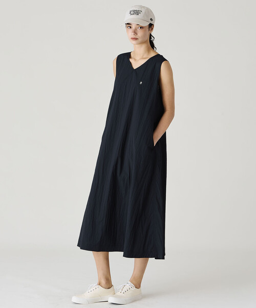 <デザイン>- Vネックのノースリーブワンピース- ゆとりのあるAラインシルエット- ロング丈- 背面に1点留めのループボタン- 両脇にシームポケット- 裏地無し<素材>- ナイロンとコットンを織り合わせたリップストップ- ワッシャー加工で程よいシワ感とハリをもたせた素材- シャリ感のあるドライタッチな肌触り※着用、お取り扱いの際は商品についておりますアテンションタグ、洗濯ネームを必ずご確認ください。※モデル撮影画像は、光の当たり具合やパソコンなどの閲覧環境によって、実際の色味と異なって見える場合がございます。商品の色味は商品単体で撮影した詳細画像をご参照ください。メーカー品番:#GY-G0120 NTKGymphlex | ジムフレックス1936年軍用ショーツを提供し始め、スポーツウェア・ブランドとして確固たる地位を築く。現在はスポーツというシーンにとらわれず、ユニセックスのカジュアルウェアを展開している。