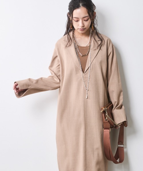 ジャケットの品格、ワンピースの解放感。日常をクラスアップさせる、 大人の余裕を纏う一着。 ■デザイン 纏うだけで都会的なムードを醸し出す、 洗練された大人のためのワンピース。 顔周りをシャープに見せる ノッチドラペル(テーラード襟)を採用。 深めのVネックが、女性らしい抜け感と デコルテの美しさを引き立てます。 ストンと落ちる洗練されたリラックスストレートシルエットが、 身体のラインを拾わずにスタイルアップを叶えます。 足元に表情を添える 深めのスリットで、 ロング丈ながら軽やかな足さばきを実現。 レイヤードしたボトムスを覗かせるなど、 旬の着こなしも楽しめます。 袖をラフに捲り上げることで、よりこなれた印象に。 両サイドには便利なポケットも配し、 デイリーユースに最適な一着に仕上げました。 ■素材 「上品な落ち感と、さらりとした肌触り」 適度なハリ感と滑らかなドレープ性を兼ね備えた、 きれい見えする素材を使用しています。 肌離れが良く、 さらりとした質感が一日中快適な着心地をキープ。 ■おすすめのスタイリング Effortless Elegance:ベージュを1枚で。 華奢なサンダルとゴールドのアクセサリー、 パールを重ねて、大人の気品漂うミニマルな装いに。 Urban Casual:ホワイトのインナーとスニーカーを合わせ、 サングラスでエッジを効かせた都会的なカジュアルダウン。 Modern Layered:ブラックの下にホワイトのワイドパンツを忍ばせ、 スリットから覗かせる上級者レイヤード。 モノトーンでまとめてモードな表情に。 <仕様> 左脇スリット約34cm 透け感:なし 伸縮性:なし 生地の厚み:普通 光沢感:なし 裏地:なし ポケット:あり(両脇) 季節:春・秋向き シルエット:普通 <洗濯方法> 手洗い <対応サイズ> M :バスト:79~90/ウエスト:64~69/ヒップ:91~95 L :バスト:86~94/ウエスト:69~77/ヒップ:92~100 LL :バスト:93~101/ウエスト:77~85/ヒップ:97~105 3L :バスト:100~108/ウエスト:85~93/ヒップ:102~110 4L :バスト:107~115/ウエスト:93~101/ヒップ:107~115 5L :バスト:114~122/ウエスト:101~109/ヒップ:112~120 ※こちらはヌードサイズです。 ※平置きのアイテムサイズとは異なる計測方法となりますのでご了承ください。 #ゆったり#体型カバー#二の腕カバー #大きいサイズ#プラスサイズ#大きいサイズレディース #M#L#LL#3L#4L#5L 【気になる商品はお気に入り登録がおすすめ】 ▼商品のお気に入り登録 完売カラーの再入荷通知や、ラスト1点の通知、セールの通知などお得な情報が受け取れます。 ▼ブランドのお気に入り登録 新商品や再入荷など、ブランドのお得な情報をいち早く受け取ることができます。 【CHIC STYLE】 シルエットやディティールにこだわったアイテムが好評。 色使いや素材感を大事に、洗練されたデザインと着用の力を 感じていただけるこだわり大人カジュアルを提案。 ▼公式Instagram @chicstyle_officialsite