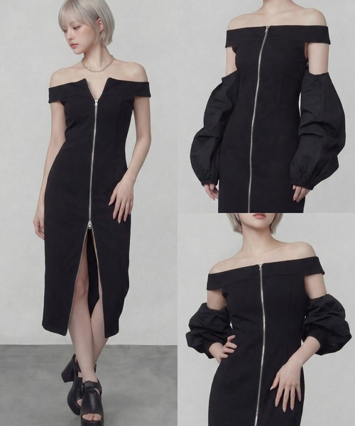 ボリュームたっぷりのバルーンパフスリーブの付け袖が付属する、フロントフルジップ仕様のオフショルワンピース。 つけ袖は脇下のボタンで着脱可能で、袖口は伸縮仕様なのでくしゅくしゅ感&ボリューム感を調整でき、二の腕の華奢見え効果◎ フロントファスナーは胸元&裾の両方からオープンできる逆開ダブルジップ仕様で、全閉じで清楚なキレイめワンピとしても、大胆に脚を出してセクシーなスリットワンピとしてもマルチに着回し可能です。 滑らかな表面感&ハリのあるスムース生地は、上品&きちんと見えな印象で、ストレッチ性もあるので着心地も◎ ボディラインを拾い過ぎない程よくタイトめなサイジングと、ウエストからヒップにかけてストンと落ちるIラインシルエットで、スッキリと細見え&スタイルアップ効果へのこだわりが詰まった優秀ワンピです。