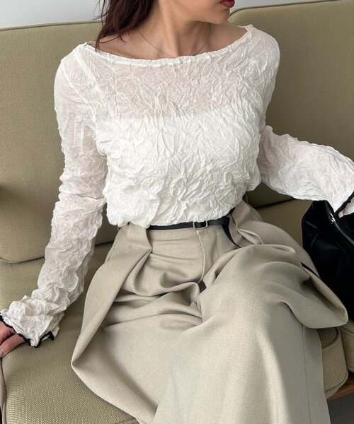 ハイゲージのニットにシワ加工を施した他にない1枚商品ポイント・平面的な生地がふんわりと立体的になりこなれ感を演出・1つ1つ微妙に異なる表情になり唯一無二の風合いが楽しめる・凹凸がある為肌への接地面積が減りさらりとした快適な着心地・ベーシックなシルエットでボトムを選ばずに着られる・やや透け感があり女性らしさもプラス・袖口の配色ラインがワンポイントスタイリングポイント・ワイドパンツに合わせて大人カジュアルに・デニム合わせの春らしいカジュアルコーデもおすすめ・ジャケットのインナーにも◎【エクリュ着用アイテム①②】レザーベルト付変形タックパンツ【ピンク着用アイテム】バイカラーウエストパンツ【グレー着用アイテム】セミフレアデニム【ブラック着用アイテム】2タックワイドパンツ**********************透け感:ややあり裏地:なし伸縮性:あり光沢感:なし**********************※店舗へは3/5の入荷を予定しております。(配送状況等により予告なく日程が変動する場合がございます。)▼洗濯方法手洗い可能※この製品はシワ加工を施している為、1点1点サイズや外観に個体差がある場合がございます。※素材の特性上、洗濯後に若干の寸法変化が生じる場合がございますが、シワ加工によるもので着用上は問題なくご使用いただけます。※シワ加工は永久的なものではなく、洗濯や着用を繰り返すことでシワの表情が変化し、消失することがあります。※撮影場所やお使いのモニター環境により若干お色味が異なる場合がございます。特にロケの撮影では明るく見える傾向にございます。※商品はサンプルで撮影をしております。若干の仕様が変更になる場合がございますので予めご了承の上ご注文くださいますようお願いいたします。▼商品のお気に入り登録完売カラーの再入荷通知や、ラスト1点の通知、セールの通知も受け取ることができます。▼ブランドのお気に入り登録新商品や再入荷など、いち早くブランドのお得な情報を受け取ることができます。