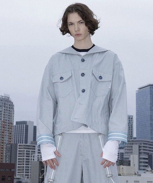 MILKBOY 2026 SPRING ・トラッドなセーラーカラーに、Gジャンのディテールを落とし込んだハイブリッドなデザイン ・襟、袖口には配色ラインがあしらわれており、マリンテイストを強調しつつ全体を引き締めるアクセントになっています ・ややゆとりのあるオーバーサイズシルエットで、ユニセックスでの着用も可能。様々なインナーとのレイヤードが楽しめます♪ ・「 SUSPENDER WORK パンツ(商品コード:101895303) 」とセットアップでの着用がおすすめ ~ Colors ~ A,アイボリー×ネイビー B,グレー/オフストライプ×アイスブルー C,ブラック ~ Size ~ 身幅 70㎝ / 着丈 65㎝ ~ Material ~ 綿100%