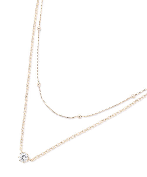 デザインが異なるチェーンを合わせた2連ネックレス。トップで光るビジューパーツが女性らしいアクセントになります。デイリーにもオフィスシーンにも使いやすいアクセサリーです。 ※モデルの着用画像の場合、光の当たり具合により、実際の色味と異なって見えることがございます。色味は、商品単体の画像をご参照ください。