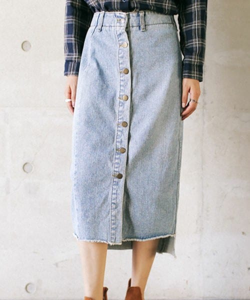今季トレンドのフロントボタンのミディ丈で大人っぽく仕上がるデニムスカートです。 前後で長さがアンバランスカットになっていたり、裾は切りっぱなしになっていたりとデザインがたくさん詰め込まれています♪ 全体的にゆったりめなので、腰ではいたり、ベルトを締めてハイウエスト気味で履いたりコーディネートを楽しめます☆ ※WEARに記載してある金額と、DHOLIC通販サイトに記載してある金額にシステム都合上、稀に誤差が生じます。正しい金額はDHOLIC通販サイトに記載された金額です。