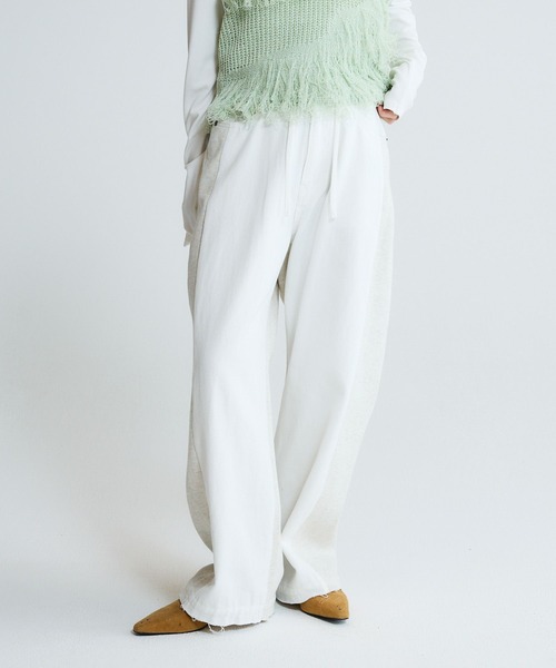 ーーー大人気のドッキングデニムをアップデート★ラクに穿ける主役級パンツ。ーーー■Designフロントには柔らかさとハリを兼ね備えたデニム、バック部分にはダンボール素材のスウェットをドッキングしたパンツ。ベーシックなアイテムながらもドッキングがスタイリングのポイントに♪脚が細く長く見える、フロント部分の切り替え位置にこだわりました。ウエストはゴム仕様ですが、ドローコードを付けることでルーズになりすぎない絶妙なバランスに◎シンプルなトップスと合わせるだけで、いつものスタイリングにこなれ感をプラスします。ラフになり過ぎないので、スウェットパンツに挑戦したい方にもオススメです。■Material綿を使用したサラッとした肌触りの生地で、着心地抜群♪程よハリりのあるダンボール素材で、カジュアルになり過ぎず、モードなスタイルにも馴染みます。■Styling甘めのシャツや、レーストップスと合わせたスタイルがオススメ♪ジャケットのような綺麗めアイテムとも好相性です。Tシャツやスウェットと合わせたラフなスタイルも◎※本製品は生産の過程で加工の風合い・色味に個体差が生じます。・透け感:やや透ける・生地の厚さ:普通・裏地:なし・洗濯:液温は30℃を限度とし、手洗いができる※さらに詳しいお手入れ方法は品質表示タグをご確認下さい。 絵表記通りのお手入れを推奨しております。-INFORMATION-◆お買い物をよりお楽しみいただく為に『♡』をクリックしてお気に入り登録がおすすめ!・完売カラーの再入荷通知や、ラスト1点の通知、セールになった際も通知を受け取ることができます★◆ブランドのお気に入り登録新商品や再入荷など、お得な情報を受け取ることができますので、是非ご登録ください♪※屋外の光や照明の当たり具合で、実際の商品の色味とカラー別画像の色味に違いが発生する場合がございます。 商品の色味はスタジオ撮影の詳細画像にてご確認ください。