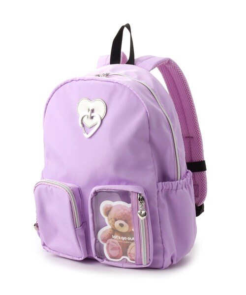 【デザイン】 ハートのカラビナがポイントのリュック。 前面には2つの立体ポケットがあり、そのうちの1つは中に入れたものが見える仕様になっています。(くまのステッカー入り) 内側には背面ポケットが1つあり、本体外側サイドにはペットボトルなどが入れられるポケットが2つついています。 チェストベルト付き。 本体外側背面は通気性のよいメッシュ素材です。 【仕様】 ・ポケット数:内側×1 外側×4 ※照明の関係により、実際よりも色味が違って見える場合があります。また、パソコン・スマートフォンなどの環境により、若干製品と画像のカラーが異なる場合もございます。 店舗へのお問い合わせ商品番号:122-05100 ●製品寸法: 00(FREE):高さ35cm 幅(上部)20cm 幅(下部)34cm マチ12cm 持ち手上がり6cm ショルダー対応サイズ38~72cm カラビナH4.5cm カラビナW4.5cm 備考:重量:約305g