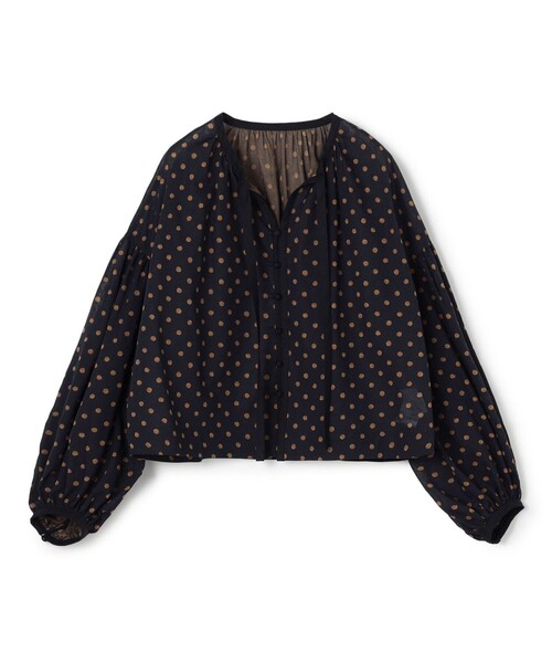 コットンボイル素材に手書き風のストライプ柄をプリントしたブラウスシリーズ。 非常に軽くて薄い、清涼感あふれる素材感が魅力です。 ギャザーをたっぷりと寄せることでビンテージライクなデザインに仕上げたブラウス。 パイピングをさりげなく効かせ、アクセントをつけています。 襟元に配した紐はラフに垂らして顔まわりに抜け感を出して着用するのがおすすめ。 すっきりとしたショート丈で合わせるボトムを選ばず、幅広いコーディネートを楽しめるアイテムです。 ■素材情報 厚み:やや薄手 透け感:ややあり 光沢:なし 伸縮性:なし 裏地:なし ※商品の色味は、商品単体または素材アップ画像をご確認ください 2026SS商品 店舗にお問い合わせの際は、下記の商品番号をお申し付けください。 商品番号:75-01-61-01103