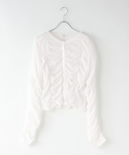 ■素材■ ポリエステルの強撚糸を使用し表情を出した トレンド性の高いシアーワッフル素材です。 ■デザイン■ 身頃にたっぷりとギャザーを施し立体的に仕上げました。 フロントを止めてトップス感覚で着ても、 さっと羽織ってレイヤードしてもバランスよく決まるので、 シーズンを通して着回ししやすいアイテムです。 ■スタイリング■ スカートで女性らしく合わせたり、パンツと合わせてカジュアルに着こなしたりと 様々なアイテムと合わせて着ていただけます。 キャミやワンピースの羽織りとしても活躍します。