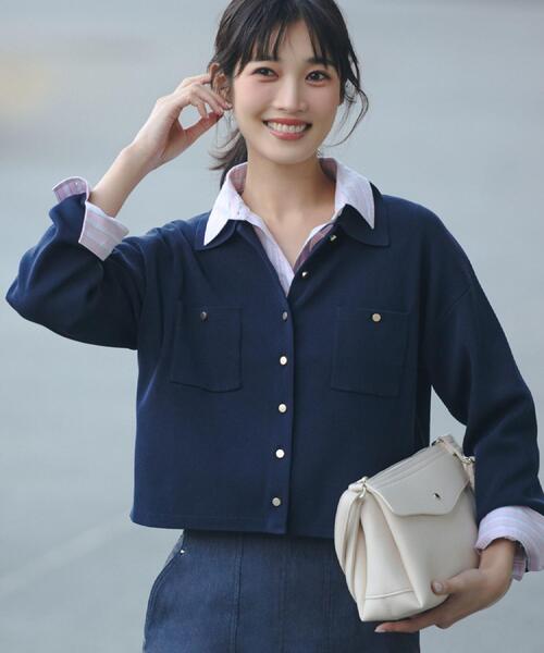きちんと感と抜け感を両立する、ジャケットライクなニットカーディガン 【デザイン】 襟付きデザインがプレッピーなムードを演出するニットカーディガンです。 小ぶりな金ボタンとポケットディテールをあしらい、クラシカルで上品な印象に仕上げています。 総針編みならではのハリ感を活かし、カーディガンでありながらジャケットのような佇まいに。 9分袖の軽やかなバランスで、季節の変わり目にも取り入れやすい一着です。 前を閉じてプルオーバーライクに着用できるのも着こなしの幅が広がるポイント。 【素材】 コットンポリエステル素材を使用し、程よいハリ感と軽やかさを両立。 きれいめな表情ながら、ニットならではのやわらかさもあり、春から初夏まで着用できます。 【スタイリング】 シャツをレイヤードして襟を覗かせた、今年らしいプレッピーな着こなしがおすすめ。 スラックスやスカートと合わせればきれいめに、デニムと合わせれば程よくカジュアルダウンも楽しめます。 羽織としても、1枚着としても活躍する汎用性の高いアイテムです。 【仕様】 ・ポケット数:前×2 ※照明の関係により、実際よりも色味が違って見える場合があります。また、パソコン・スマートフォンなどの環境により、若干製品と画像のカラーが異なる場合もございます。 【26SS】 モデル情報:身長166cm B81 W57 H86 着用サイズ:02(M) 店舗へのお問い合わせ商品番号:768-35007 ●製品寸法: 02(M):着丈50cm B100cm 袖丈40cm 肩幅51cm 03(L):着丈52cm B103cm 袖丈41cm 肩幅53cm 04(LL):着丈54cm B106cm 袖丈42cm 肩幅54cm 備考: