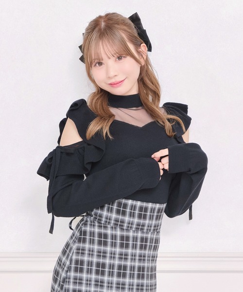 ◆甘さを添えるチュールネックニットトップス♡肩まわりのフリルデザインが自然に視線を集めてくれるニットトップス。首元には透け感のあるチュール素材を施し、さりげない肌見せで女性らしさを引き立てるデザインに仕上げました。チュール×ニットの異素材ミックスがシンプルながらも印象に残る一着。デコルテをきれいに見せつつ、上品で柔らかな雰囲気を演出してくれます。肩回りのフリルがラインを優しく包み込み、女の子らしい華奢見えを演出してくれるのも嬉しいポイントです◎落ち感のあるニット素材が身体に馴染み、着るだけでバランスよくまとまるシルエットに。シンプルで清潔感のあるデザインで、きれいめにもガーリーにも着まわしやすい万能アイテムです。カラーは柔らかい印象のgraige、甘さを引き立てるivory、引き締め役にぴったりのblackの3色展開。色によって雰囲気の違いを楽しめるのも魅力です♡---------------------------------------透け感:ややあり伸縮性:ありポケット:なしファスナー:なし裏地:なし---------------------------------------※ご覧のモニター環境や撮影環境により実際の商品と多少色味が異なって見える場合がございます。ご理解の程よろしくお願いいたします。※濃色品は、色落ち・色移りをする恐れがあります。摩擦(特に湿った状態での摩擦)や汗や雨などで他の衣料や下着(特に白物)に色移りしますので、十分ご注意ください。【お買い物をよりお楽しみいただく為に♪】▼商品のお気に入り登録をおすすめします♡をクリック!完売カラーの再入荷や、ラスト1点の通知、セールの際の通知を受ける事ができます。ブランドのお気に入り登録もご一緒にお願い致します。