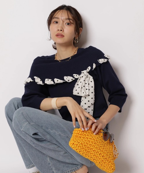肩まわりにリボントリムをあしらった、フェミニンな印象のオフショルニット。 ドット柄のリボンディテールがさりげないアクセントとなり、顔まわりを華やかに見せてくれます。 スカートで上品にまとめるのはもちろん、パンツ合わせで甘さを抑えた大人カジュアルな着こなしもおすすめです。 【ご注意】 ※撮影照明の関係により、実際の商品と色味が異なって見える場合がございます。 また、パソコン・スマートフォンなどの環境により、製品と画像のカラーが異なる場合もございます。 予めご了承ください。 ※商品画像はサンプルのため、色味やサイズ等の仕様に変更がある場合がございますので、予めご了承ください。