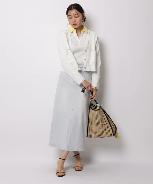 すっきりとしたIラインが大人っぽさを引き立てる、デニム素材のスリムタイトスカート。 程よく体に沿うシルエットで、カジュアルながらも女性らしい印象に仕上げています。 フリルやブラウスなど甘めトップスとも好相性で、スタイリングを品よく引き締める一枚。 パンプスでフェミニンに、フラットシューズで抜け感を出した着こなしもおすすめです。 【ご注意】 ※撮影照明の関係により、実際の商品と色味が異なって見える場合がございます。 また、パソコン・スマートフォンなどの環境により、製品と画像のカラーが異なる場合もございます。 予めご了承ください。 ※商品画像はサンプルのため、色味やサイズ等の仕様に変更がある場合がございますので、予めご了承ください。