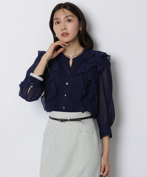 立体的なフリルを重ねたデザインが、顔まわりを華やかに演出するショート丈ブラウス。 シアー感のある素材が軽やかな印象を与えつつ、甘さを程よく抑えた大人バランスに仕上げています。 一枚で主役になる存在感があり、きれいめからフェミニンスタイルまで幅広く活躍します。 【ご注意】 ※撮影照明の関係により、実際の商品と色味が異なって見える場合がございます。 また、パソコン・スマートフォンなどの環境により、製品と画像のカラーが異なる場合もございます。 予めご了承ください。 ※商品画像はサンプルのため、色味やサイズ等の仕様に変更がある場合がございますので、予めご了承ください。
