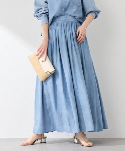 ふんわり軽やか。大人のリラックススカート●デザイン ふんわり柔らかく薄手の素材感が春夏にぴったりのスカート。 身体のラインを拾わないフレアシルエットが可愛く体型カバーにも◎やや幅広のウエストデザインがトップスインしても腰回りをスッキリと見せてくれます。柔らかな生地感とウエスト後ろゴム仕様で、動きやすく、穿き心地も抜群。大人のリラックスムード漂う1枚です。●ポイント・春夏にピッタリの薄手素材・後ろゴム仕様で楽な履き心地・着回し力抜群・30℃限度で洗濯機(弱)洗い可能●おすすめのコーディネートタイトなトップスをインしてすっきりと着こなしたりオーバーサイズのトップスはフロントインで抜け感を演出するのもおすすめ。Tシャツやスニーカーでカジュアルなスタイルも◎デニムシャツを合わせたセットアップ風コーデもおすすめです。※LBZ1061304A0001シアーデニムショート丈袖口リブシャツとのセットアップ風着用もおすすめ●おすすめのシーン / 着こなし休日スタイル 韓国ファッションオフィスカジュアル 空港コーデノームコアコーデ洗濯方法:30℃限度の洗濯機(弱)洗いが可能透け感:ややあり光沢:なし裏地:ペチコートの付属あり生地の厚さ:薄手伸縮性:なしウエストゴム:バックゴムありファスナー:ありポケット:あり