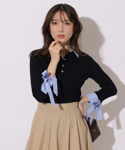 ひらりと揺れる裾リボンが目を惹くリブニット。 まるでレイヤードスタイルのような首元のスキッパーデザインが、こなれた雰囲気に。 ややタイトなシルエットながらも、柔らかな質感で動きやすく着心地も抜群。 コンパクトな丈感で、ボリュームのあるボトムスでも好バランスに着こなせます。 【ご注意】 ※撮影照明の関係により、実際の商品と色味が異なって見える場合がございます。 また、パソコン・スマートフォンなどの環境により、製品と画像のカラーが異なる場合もございます。 予めご了承ください。 ※商品画像はサンプルのため、色味やサイズ等の仕様に変更がある場合がございますので、予めご了承ください。
