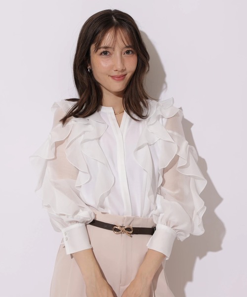 立体的なフリルデザインが華やかに魅せるブラウス。ほんのりと素肌を覗かせるディテールが大人上品な雰囲気に。袖はボリュームのあるリボンをあしらい甘さをプラス。比翼仕立てのフロントデザインがきちんと感を演出し、コーデの幅を広げます。一枚で着映え効果を発揮する存在感抜群のアイテムです。【ご注意】※撮影照明の関係により、実際の商品と色味が異なって見える場合がございます。また、パソコン・スマートフォンなどの環境により、製品と画像のカラーが異なる場合もございます。予めご了承ください。※商品画像はサンプルのため、色味やサイズ等の仕様に変更がある場合がございますので、予めご了承ください。