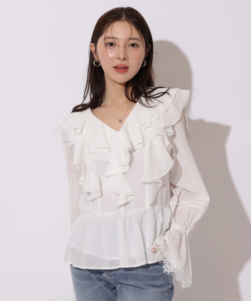 甘めなフリルデザインがポイントのブラウス。フレアスリーブに合わせたレースがレトロキュートな雰囲気に。ボリューミーなディテールながらもコンパクトな丈感の絶妙なバランスがコーデをスッキリと仕上げます。一枚はもちろん、ジャケットのインナーとして合わせるだけでディテールがより引き立ちます。【ご注意】※撮影照明の関係により、実際の商品と色味が異なって見える場合がございます。また、パソコン・スマートフォンなどの環境により、製品と画像のカラーが異なる場合もございます。予めご了承ください。※商品画像はサンプルのため、色味やサイズ等の仕様に変更がある場合がございますので、予めご了承ください。