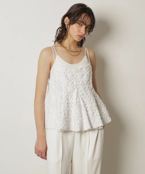 立体感のあるレース素材を使用し、表情豊かに仕上げたキャミソール。 華奢なストラップとバックスタイルのライン使いが、レイヤード時にもさりげないアクセントになります。 ロンTやニットに重ねるだけで、いつものスタイリングに奥行きをプラスできる一枚です。 【ご注意】 ※撮影照明の関係により、実際の商品と色味が異なって見える場合がございます。 また、パソコン・スマートフォンなどの環境により、製品と画像のカラーが異なる場合もございます。 予めご了承ください。 ※商品画像はサンプルのため、色味やサイズ等の仕様に変更がある場合がございますので、予めご了承ください。