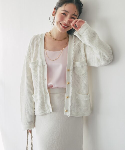 ジャケット感覚で着られる、大人の名品カーディガン●デザイン昨年ご好評いただいた、ジャケット感覚で着られるカーディガンが今季らしくアップデート!釦の形状を変更し、より洗練された印象に仕上げました。綿麻混のさらっとした糸に、さりげなくラメを織り込んだ素材を使用。軽やかな透け感と凹凸のある編地が、女性らしく上品な表情を演出します。フリンジディテールがツイードジャケットのようなきちんと感をプラスし、すっきりとしたVネックで、バランス良く着こなせる一枚に。オン・オフ問わず幅広いシーンに活躍します。●ポイント・ジャケット感覚で着られる上品なデザイン・綿麻混×ラメ糸の軽やかな素材・フリンジ&メタルボタンで程よいきちんと感・オンオフ活躍・手洗い可能●おすすめコーディネートきれいめパンツやタイトスカートと合わせれば、通勤やきちんとしたシーンに。デニムやフレアスカートと合わせて、程よくカジュアルダウンした着こなしもおすすめです。春先から初夏まで、軽い羽織として長く活躍します。●おすすめのシーン / 着こなしお呼ばれ 同窓会 謝恩会 婚活 街コン入学式(入園式) 卒業式(卒園式) 演奏会 発表会 学校行事 セレモニーきれいめカジュアル オフィスカジュアルシンプルコーデ 飲み会コーデ 洗濯方法:手洗い透け感:ややあり裏地:なし伸縮性:ややあり生地の厚さ:ふつう光沢:ありポケット:あり#cate001