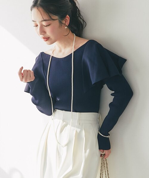 フリルが映える、大人可愛い着映えニット ●デザイン 肩のフリルデザインが大人可愛いフリルニット。 デコルテを美しく見せるネックラインと、 印象的な袖のデザインが、シンプルな中にも華やかさを添えます。 身頃はリブ編みで、すっきりと上品な印象に。 春先にちょうど良いさらりとした素材感で、 オフィスからお出かけまで、様々なシーンで活躍すること間違いなしです。 ●ポイント ・着映えするフリルデザイン ・デコルテが綺麗に見えるネックライン ・手洗い可能 ●おすすめのコーディネート カジュアルなデニムスタイルに合わせれば、程よい抜け感をプラス。 フレアスカートやワンピースと合わせれば、フェミニンで上品な印象で着こなせます。 ●おすすめのシーン / 着こなし きれいめカジュアル オフィスカジュアル シンプルコーデ 飲み会コーデ 洗濯方法:手洗い 透け感:なし 裏地:なし 生地の厚さ:ふつう 伸縮性:あり #cate001